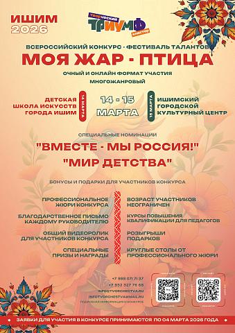 14-15 марта 2026 г. в г. Ишим Тюменской области пройдет Всероссийский конкурс-фестиваль талантов «Моя Жар-Птица» (многожанровый очный и онлайн формат участия).